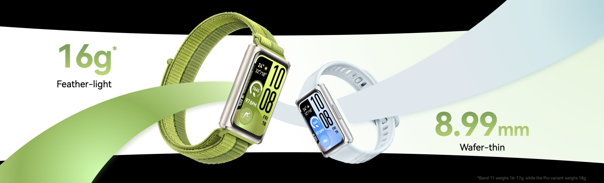 HUAWEI Band 11 Pro and the breathable, skin-friendly strap of the HUAWEI Band 11. Alongside this, the larger display keeps pace, heart rate, and performance metrics visible and organized. From the boardroom to the track, the HUAWEI Band 11 Series delivers smartwatch-level visibility in an ultra-slim and lightweight form.
