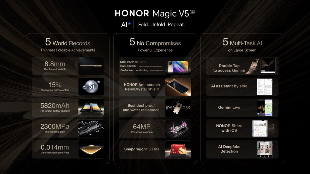 The HONOR Magic V5 sets a new industry benchmark for portability in foldable smartphones, featuring an ultra-slim 8.8mm body and weighing as little as 217g. These advancements reflect HONOR’s relentless pursuit of engineering excellence, made possible by the industry leading AI-powered manufacturing system. This revolutionary process enhances structural reliability and integrity, delivering an almost crease-free fold and elevating the user experience that can be felt with every interaction.